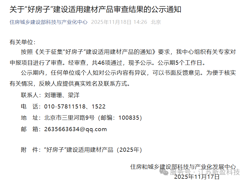 江苏新盈智能装备科技有限公司“钢筋桁架混凝土薄壁板”顺利通过“好房子”建设适用建材产品公示